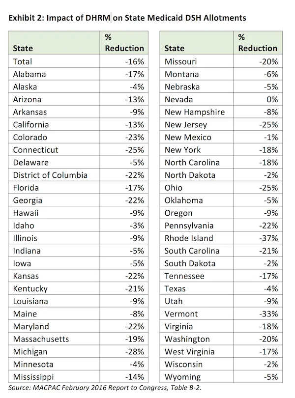 DHRM modeling better targets Medicaid DSH at the state level, but leaves open the question as to how states actually distribute their overall allotment to hospitals within their borders. It is very difficult to model how states would approach this problem. Exhibit 2, taken from the MACPAC February 2016 Report to Congress, shows how DHRM might change Medicaid DSH allotments across states under the DHRM.