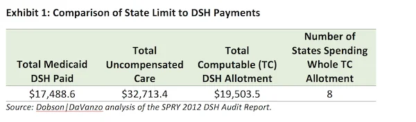 Plans to reform Medicaid DSH program typically start with the program’s current spending in each state. This is because the implementation of a system which radically changes the existing Medicaid DSH payment structure could be traumatic to states that see large decreases in Medicaid DSH payments, however, there are some ways to start reforming the system that would decrease payments with minimal disruption. For example, some states do not utilize the total amount of Medicaid DSH that is available to them under the Medicaid DSH limit, the sum of uncompensated care in all the hospitals in each state. See Exhibit 1.