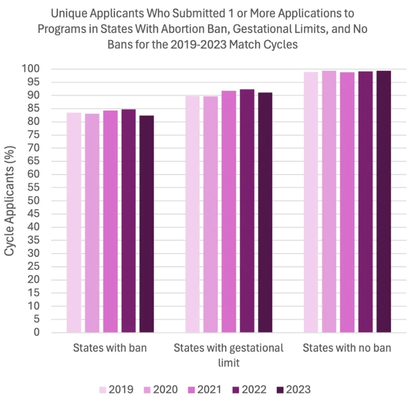 The graph above illustrates a slight decrease in residency applicants in states with bans in 2023 (82.4%) compared to the previous year (84.7%). A similar decrease was observed in states with gestational restrictions. Comparatively, there was no change in applications in states without bans.
